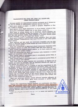 El comencament del breu colofo en llati, traduit a la lletra, diu: 'Acaba el llibre de les elegancies de Joan Esteve home eruditissim ciutada valencià per real autoritat notari public, en llatina i valenciana llengua ab exactissima diligencia esmenat. [... Explicit liber elegantiarum Johannis Stephani viri eruditissimi civis Valentiani regie auctoritate notarii publici: latina et valentiana lingua: exactissima diligentia emendatus...]