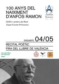 [editar | editar còdic]- En commemoració del centenari del naiximent d'Anfós Ramon (1924-2024), les entitats valencianes i valencianistes (Real Acadèmia de Cultura Valenciana, Lo Rat Penat i l'Associació d'Escritors en Llengua Valenciana) celebraren una série d'actes en la Fira del Llibre de Valéncia de l'any 2024 (Jardins del Real-Espai Fuente Primavera), donant a conéixer part de la seua obra poètica per mig d'un recital poètic.