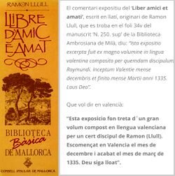 [editar | editar còdic]La primera vegada que trobem la denominació de llengua valenciana la tenim en el comentari expositiu del Liber amici et amati, escrit en llatí, originari de Ramon Llull, que es troba en el foli 34v del manuscrit ‘N. 250. sup’ de la Biblioteca Ambrosiana de Milà, diu: