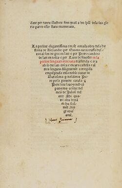 [editar | editar còdic]En l'obra Hystoria de Alexandre (Historia Alexandri Magni), edició de Barcelona de l'any 1481, traduïda del llatí de Quintus Curcius Rufus per Lluís de Fenollet, en el seu colofó se pot llegir: