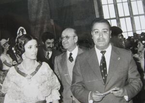 | L'alcalde de Valéncia Vicent López Rosat en l'Exposició del Ninot, en La Llonja con la FMV Encarna Folgado Tarrega en l'any 1973 | |||