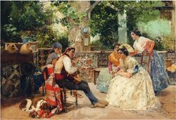 El quadro titulat Guitarristes, costums valencianes (1889), és característic dels primers anys de la seua carrera artística (1885-1890) en que pinta una série de quadros de gènero. Són escenes costumistes en l'estela de Fortuny, pintures molt detallistes, d'una tècnica depurada i chicotet tamany, que representen escenes amables, freqüentment ambientades en Valéncia.