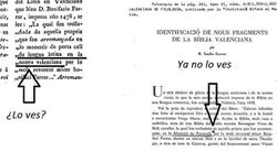 Fotocòpia de la transcripció de la Biblia Valenciana per Sanchis Guarner, on pot vore's entre les llínees huit i dèu que diu: "fon arromançada, en lo Monestir de Portaceli, per lo molt reverend micer Bonifaci Ferrer". Quan en el text original lo que diu és: "fon arromançada en lo monestir de portaceli de lengua latina en la nostra valenciana per lo molt reuerend micer bonifaci ferrer" (el fragment omés s'ha senyalat en negreta) (Revista Valenciana de Filologia, Tom VI, nº 2-3)