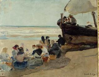El quadro es tracta d'un grup de peixcadores assentades en l'arena i protegint-se del sol per l'ombra que proyecta la vela desplegada d'una barca, que es troba a la dreta. Sobre la barca, tres peixcadors. La mar en bandes de bromera, i el cel blau-dorat.