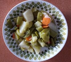 [editar | editar còdic]Posem una caçola a mitan d'aigua a bollir, a foc fort, i mentres tant preparem les bajoques tallant les puntetes; les creïlles, les cebes i les carlotes les pelem. Quan tingam les creïlles i les verdures preparades les afegirem a la caçola. Ho taparem i el deixarem bollir durant 20 o 30 minuts. Una volta comença a bollir l'aigua tenim que baixar la força del foc per a que el bollit es faça lentament. Una manera de comprovar si està en el seu punt és punchant la creïlla per saber si encara està dura o ya està tendra.