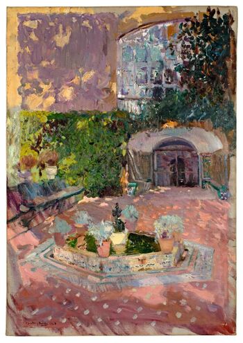 Una font hexagonal en varis tests en el centre, a l'esquerra, massiç de plantes i, a la dreta, més retardat, un pabelló o hivernàcul. Al fondo mur encalat, a on s'obri un gran finestral. Predomini en el color de roses, malves i ocres.