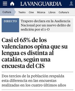 - Casi el 65% de los valencianos opina que su lengua es distinta al catalán, según una encuesta del CIS - La Vanguardia